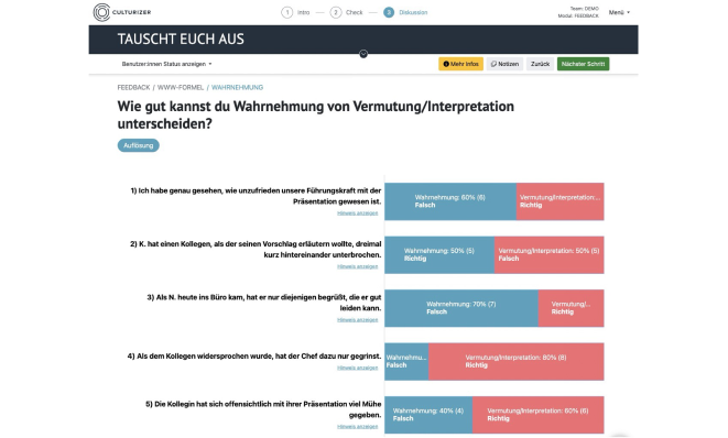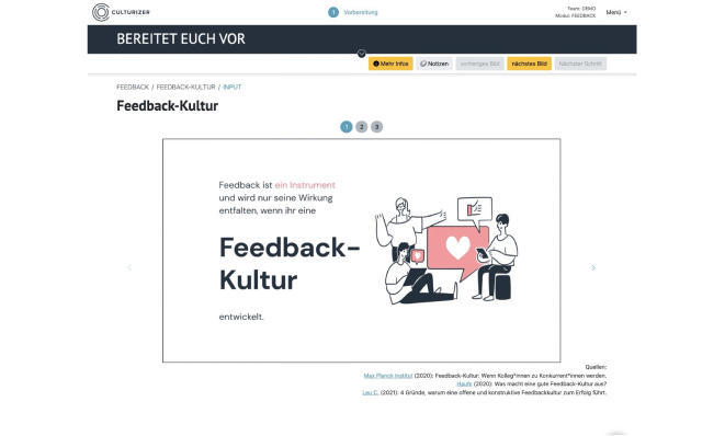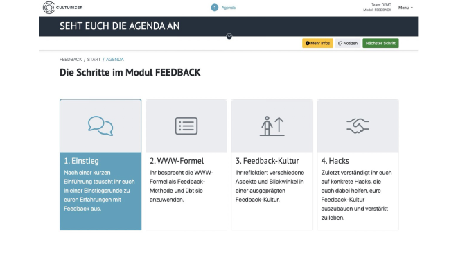 Das Culturizer FEEDBACK-Modul ist euer digital moderierter Team-Workshop. Legt gemeinsam die Grundlage für eine Kultur, in der offene Worte und konstruktive Kritik euch jeden Tag besser machen.